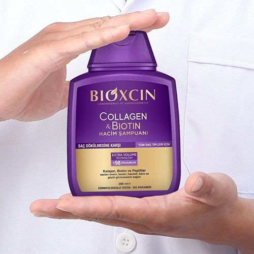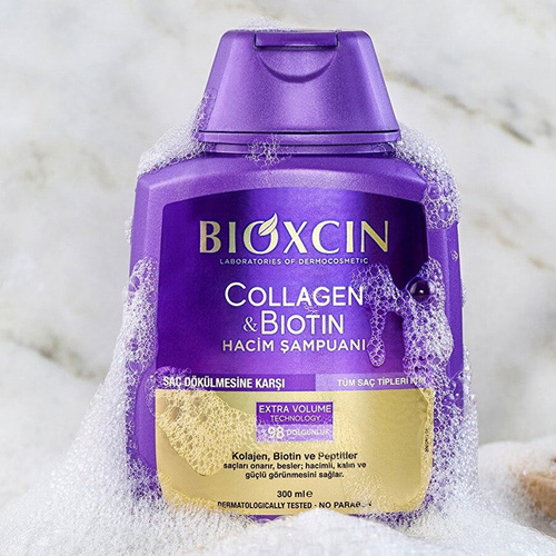 شامپو بیوکسین ضد ریزش حاوی بیوتین و کلاژن حجم 300 میل محصولی از شرکت بیوکسین BIOXCIN ترکیه است . شامپو bioxcin گیاهی ضدریزش ترمیم کننده با فرمولاسیون قدرتمند و با بهره گیری از عصاره های کاملا طبیعی و انواع ویتامین ها و مواد معدنی برای کنترل ریزش مو طراحی شده است . شامپو حجم دهنده کلاژن و بیوتین بیوکسین برای موهای نازک و ضعیف بسیار مناسب می باشد . شامپوی ضد ریزش قدرتمند بیوکسین، حاوی کلاژن هیدرولیز شده،بیوتین و پپتیدهای فعال زیستی فعال می باشد که باعث تقویت ساختار مو می باشد. وچود بیوکمپلکس B11 در ترکیبات این شامپوی بیوکسین از ریزش مو جلوگیری می کند. عدم وجود پارابن و مواد عطری و حساسیت زا در ترکیبات شامپو کلاژن بیوکسین، این شامپو را برای انواع مو و بویژه موهای حساس بسیار مناسب می باشد .
